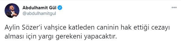 Bakan Gül, Twitter hesabından yaptığı açıklamada, "Aylin Sözer'i vahşice katleden caninin hak ettiği cezayı alması için yargı gerekeni yapacaktır" ifadesini kullandı.