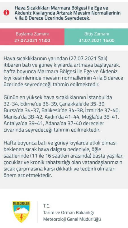 Açıklamanın devamında "Hafta boyunca batı ve güney kıyılarda etkili olması beklenen sıcak hava dalgası nedeniyle,11.00 ile 16.00 saatleri arasında başta yaşlılar, çocuklar ve kronik rahatsızlığı olan vatandaşlarımızın sıcak çarpmasına karşı dikkatli ve tedbirli olmaları önem arz etmektedir" uyarısı yer aldı.