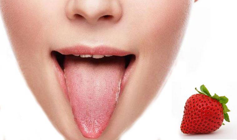 dudaklar, kırmızı "çilek dili" bulgusu ve boğazda kızarıklık gibi