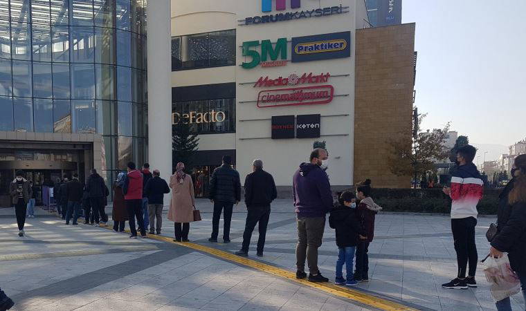 Hunat Mahallesi'nde bulunan alışveriş merkezi önünde uzun kuyruk oluştu. Maske takıp, sosyal mesafe kuralına uyanlar, alışveriş merkezine girmek için bir süre kuyrukta bekledi. Alınan güvenlik önlemleri kapsamında ateşleri ölçülen müşteriler, tek tek içeri alındı.