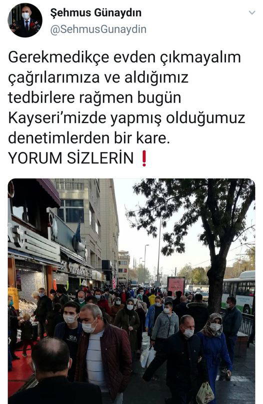 Öte yandan Kayseri Valisi Şehmus Günaydın, dün Twitter'daki hesabından Sivas Caddesi'ndeki insan yoğunluğunu gösteren fotoğrafı paylaşarak, "Gerekmedikçe evden çıkmayalım. Çağrılarımıza ve aldığımız tedbirlere rağmen Kayseri'de yapmış olduğumuz denetimlerden bir kare. Yorum sizlerin" demişti.