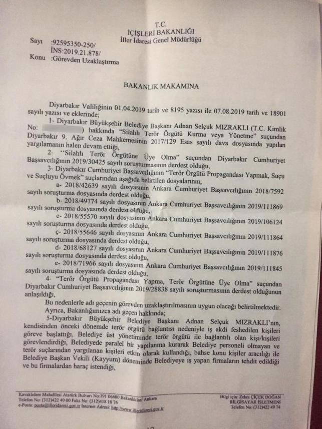 İçişleri Bakanlığı İller İdaresi Genel Müdürü Ali Çelik tarafından, Diyarbakır Valiliği'nin 1 Nisan ve 7 Ağustos tarihli 2 ayrı yazısına atıfta bulunulan yazıda, Mızraklı hakkındaki soruşturma ve kovuşturmalara yer verildi. Ayrıca Mızraklı yönetiminin, kayyım döneminde belediyeyle iş yapan müteahhitleri tehdit ettiği ve haraç aldığı öne sürüldü. Mızraklı'nın yerine kayyım atanması talep edilen yazının, İçişleri Bakanı Süleyman Soylu'ya gönderildiği ve Soylu tarafından"olur" denilerek, onaylandığı ve imzalandığı belirlendi.