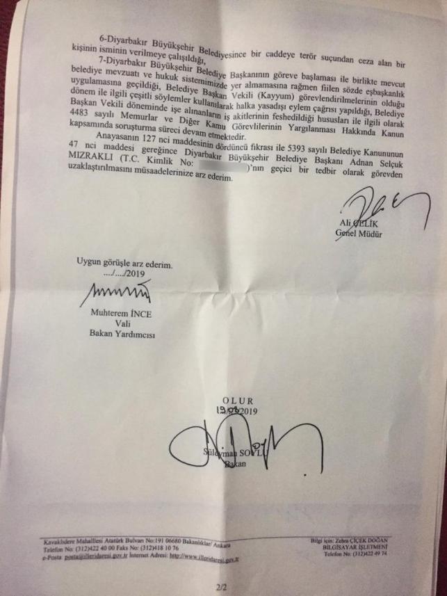 İçişleri Bakanı Süleyman Soylu'nun 19 Ağustos tarihli kararıyla, Diyarbakır Büyükşehir Belediyesi Eş Başkanı Adnan Selçuk Mızraklı, Mardin Büyükşehir Belediyesi Eş Başkanı Ahmet Türk ve Van Büyükşehir Belediyesi Eş Başkanı Bedia Özgökçe Ertan, görevden alındı. Bölgede bir anda tansiyonu artıran gelişme ile ilgili olarak AKP sözcüleri, kararın siyasi değil, hukuki olduğunu savundu. Ancak, Diyarbakır Valiliği'nin, İçişleri Bakanlığı Mahalli İdareler Genel Müdürlüğü'ne gönderdiği bir yazı, kayyım atanması hazırlığının 31 Mart seçimlerinin sonuçlarının ne resmi ne de gayri resmi olarak sonuçlarının belli olmadığı, dolayısıyla Mızraklı'nın henüz başkan olmadığı 1 Nisan günü başladığını ortaya çıkardı.