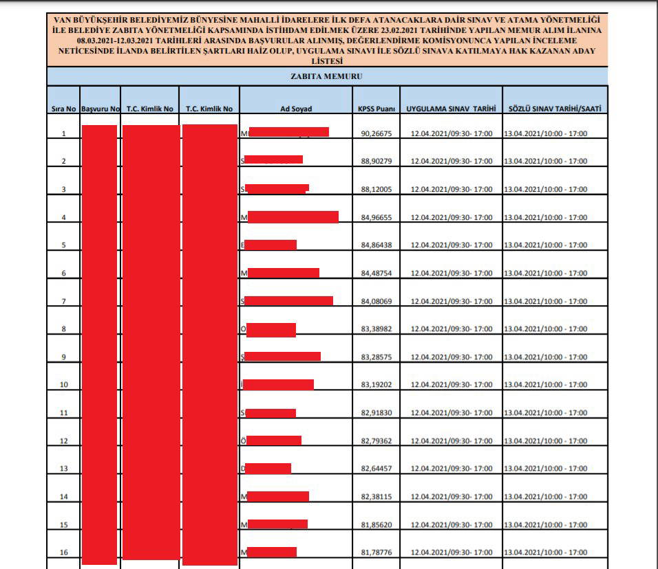 Van Büyükşehir Belediyesi, 15 kişilik zabıta alımı gerçekleştirdi. Alımda KPSS puanıyla ilk 15’e girenden sadece 2 kişi ‘mülakat’ engelini aşabildi. KPSS'den yüksek puan alan 13 kişi ise mülakat engeline takıldı. Yerlerine alınan kişilerin ise KPSS'den aldıkları düşük puanları mülakat ile yükseltildi.