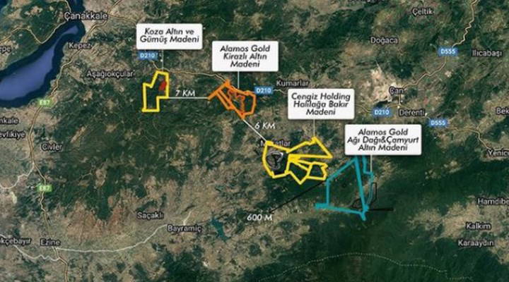 Kazdağları Kardeşliği tarafından madenlerin birbirine yakınlığını göstermek amacıyla paylaşılan harita