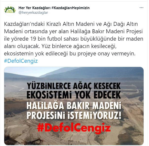 Halilağa Bakır Madeni Projesi ile 19 bin futbol sahası büyüklüğünde bir maden alanı oluşacağını bildirilen Kazdağları Kardeşliği’nin paylaşımında, “Kazdağları’ndaki Kirazlı Altın Madeni ve Ağı Dağı Altın Madeni ortasında yer alan Halilağa Bakır Madeni Projesi ile yörede 19 bin futbol sahası büyüklüğünde bir maden alanı oluşacak. Yüz binlerce ağacın kesileceği, ekosistemin yok edileceği bu projeye onay vermeyin” denildi.