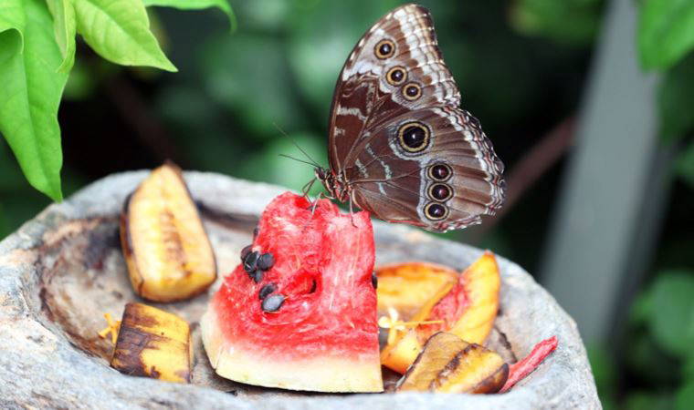 Mevsimine göre en uygun meyvelerle beslenen kelebeklere, yaz döneminde, kokteyl olarak hazırlanan karpuz, şeftali, vişne gibi meyveler veriliyor. Kelebekler, başlarının altındaki, beslenme zamanı dışında spiral halinde kapalı bulunan, açıldığında ise hortuma benzeyen tüplerle besleniyor. Önce tat alma duyularının bulunduğu ayaklarıyla besini kontrol eden kelebekler, bu tüplerle meyvelerin sıvılarını emiyor.