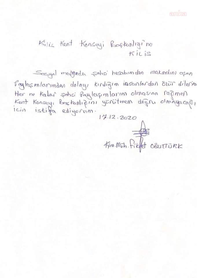 Oğuztürk, bugün görevinden istifa ettiğini duyurdu. İstifa dilekçesini Kilis Kent Konseyi Başkanlığı’na sunan Oğuztürk, “Paylaşımlarından dolayı kırdığım insanlardan özür dilerim. Her ne kadar kalevi şahsi paylaşımlarım olmasına rağmen Kent Konseyi Başkanlığını yürütmem doğru olmayacağı için istifa ediyorum” dedi.