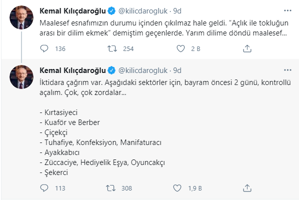 Twitter'dan "İktidara çağrım var. Aşağıdaki sektörler için, bayram öncesi 2 günü, kontrollü açalım. Çok, çok zordalar..." diyen Kılıçdaroğlu, şu sektörleri sıraladı: