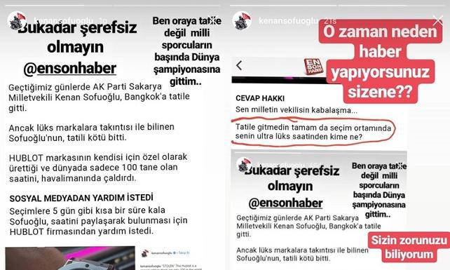 Hükümete yakınlığıyla bilinen En Son Haber, Sofuoğlu’nun 560 bin liralık saatini kaybetmesini “Seçime 5 gün kaldı vekil Kenan’ın derdine bak" ifadeleri ile duyurdu.