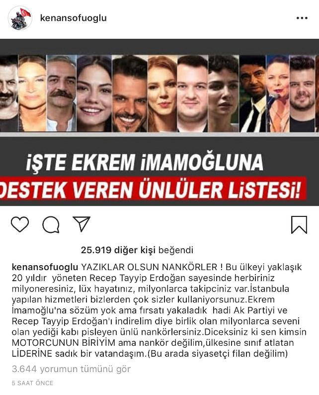 "Yazıklar olsun nankörler! Bu ülkeyi yaklaşık yirmi yıldır yöneten Recep Tayyip Erdoğan sayesinde her biriniz milyonersiniz, lüks hayatınız, milyonlarca takipçiniz var .İstanbul'a yapılan hizmetleri bizlerden çok sizler kullaniyorsunuz. Ekrem İmamoğlu'na sözüm yok ama 'Fırsatı yakaladık hadi Ak Parti'yi ve Recep Tayyip Erdoğan'ı indirelim' diye birlik olan milyonlarca seveni olan yediği kabı pisleyen ünlü nankörlersiniz. Diyeceksiniz ki; 'Sen kimsin?' Motorcunun biriyim ama nankör değilim. Ülkesine sınıf atlatan liderine sadık bir vatandaşım. (Bu arada siyasetçi falan değilim)"