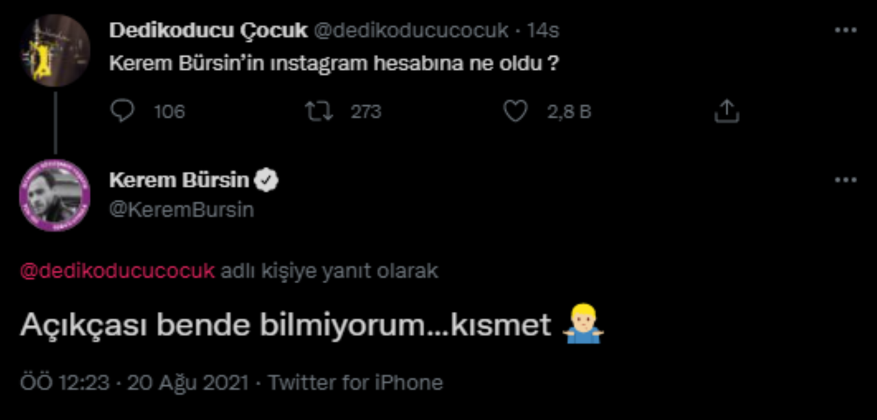 İkinci sezonuyla ekranlarda olan 'Sen Çal Kapımı' dizisinde Hande Erçel ile birlikte başrolü paylaşan Kerem Bürsin'in Instagram hesabına ulaşılamıyor.