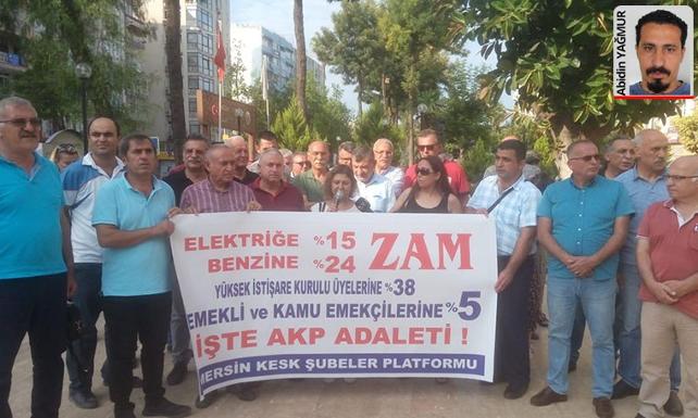 Dün, Özgür Çocuk Parkı’nda bir araya gelen KESK üyeleri adına konuşan ve aynı zamanda Tüm-Bel-Sen Mersin Şube Başkanı olan Solak, şunları vurguladı: “TÜİK resmi enflasyonu düşük göstermeye çalışsa da, bu ülkede yaşayan 81 milyon, sokakta, pazarda yaşanan gerçek enflasyonun en az yüzde 40 olduğunu biliyor. Buna karşın maaşlarımızda yüzde 5’lik toplusözleşme zammını, yüzde 1’lik enflasyon farkını, iki günlük çocuk bezi almaya yetmeyen çocuk yardımının üç beş kuruş artırılmasını ‘memura 3 zam birden’ diye sunanları, en düşük maaşı 700 lira fazla gösterenleri buradan kınıyoruz.”