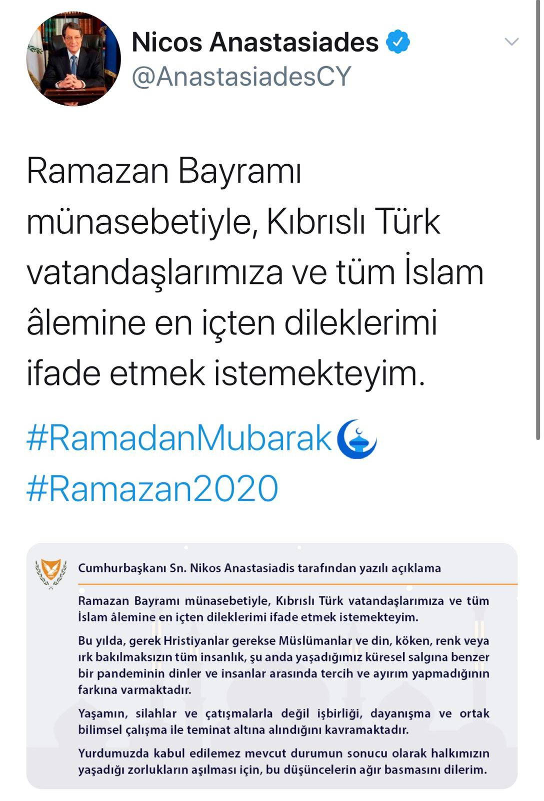 Rum yönetimi lideri Anastasiadis, Kıbrıslı Türklere ve İslam alemine yönelik Ramazan Ayı için bir mesaj yayınladı. Anastasiadis mesajını, sosyal medyada hesabında ilk önce Yunanca olarak paylaştı. Anastasiadis, Yunanca mesajında, Kıbrıslı Türklere hayırlı bir Ramazan ayı geçirmeleri dileğinde bulundu. Rum lider daha sonra Türkçe olarak mesajını yayınladı. Ancak Türkçe çeviride, “Ramazan ayı” yerine “Kıbrıslı Türklerin Ramazan Bayramı’nı kutlandığı” mesajını paylaştı. Bunun üzerine Kıbrıslı Türkler, ‘Ramazan Ayı, Ramazan Bayramı değil’ diyerek Anastasiadis’e tepki gösterdi.