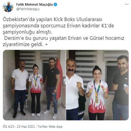 "Özbekistan'da yapılan Kick Boks Uluslararası şampiyonasında sporcumuz Erivan kadınlar K1'de şampiyonluğu almıştı. Dersim'e bu gururu yaşatan Erivan ve Gürsel hocamız ziyaretimize geldi. Gençlerimizin spor faaliyetlerine yönelmesi bizim için büyük bir anlam taşıyor. Kendilerine teşekkür etmekle beraber belediye olarak her daim yanlarında olacağız."
