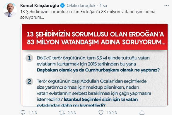 Irak'ın kuzeyinde bulunan Gara’da aralarında asker ve polislerin de olduğu 13 yurttaşın şehit edilmesiyle ilgili CHP Genel Başkanı Kemal Kılıçdaroğlu, sosyal medya hesabından Erdoğan'a 5 maddelik soru yöneltti.