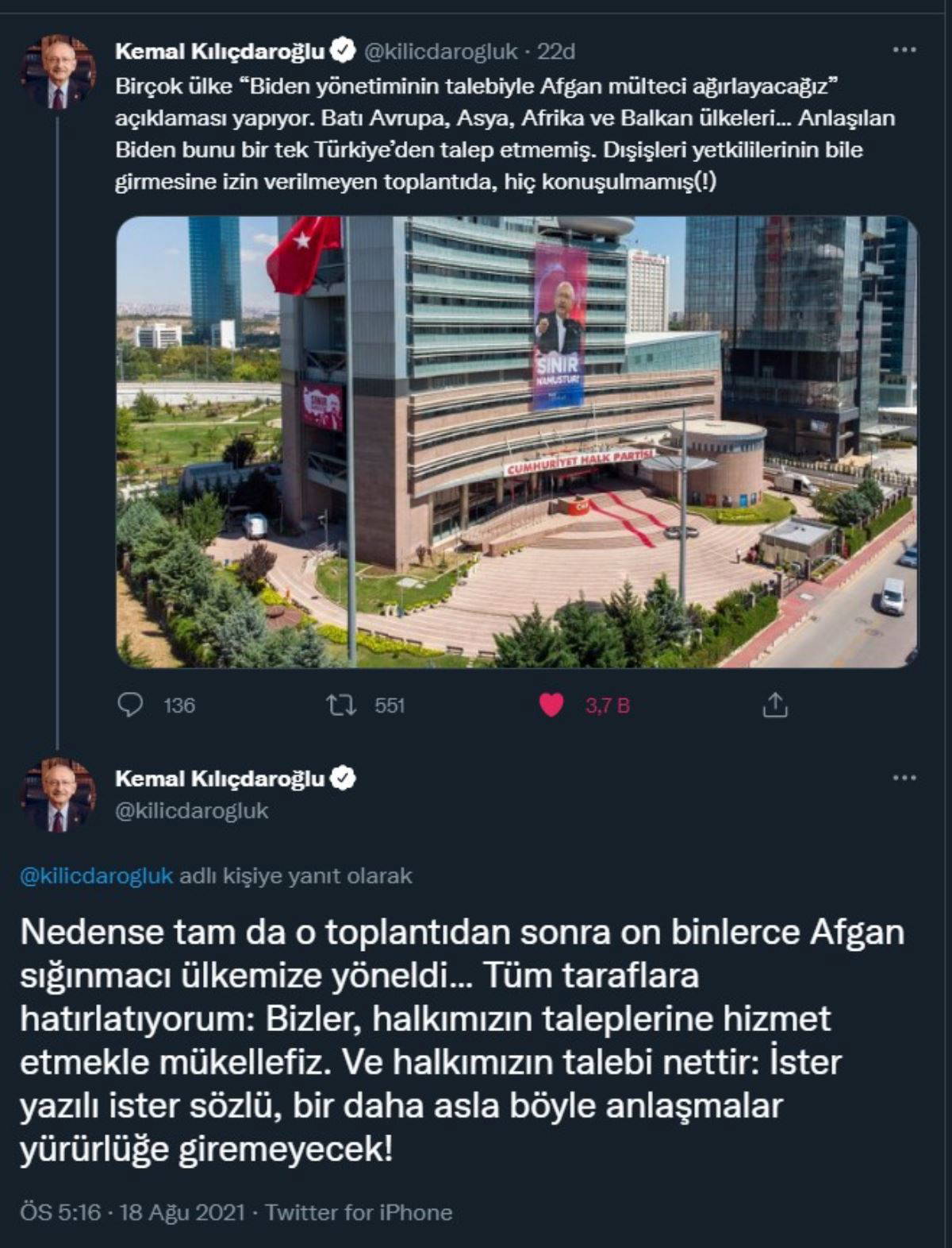Toplantının ardından on binlerce sığınmacının Türkiye'ye yöneldiğini belirten Kemal Kılıçdaroğlu, bir kez daha ABD'ye ve söz konusu anlaşmaya dikkat çekti. Kılıçdaroğlu mesajında, "Nedense tam da o toplantıdan sonra on binlerce Afgan sığınmacı ülkemize yöneldi… Tüm taraflara hatırlatıyorum: Bizler, halkımızın taleplerine hizmet etmekle mükellefiz. Ve halkımızın talebi nettir: İster yazılı ister sözlü, bir daha asla böyle anlaşmalar yürürlüğe giremeyecek!" dedi.