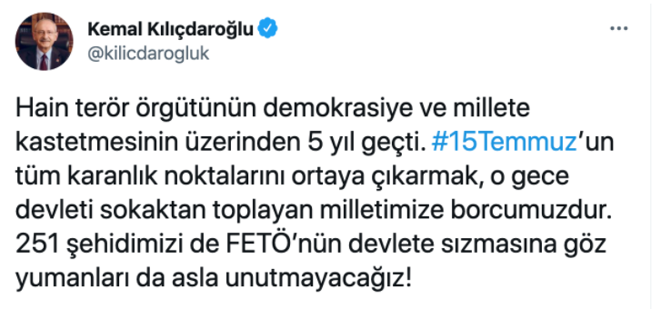 CHP lideri Kılıçdaroğlu, 15 Temmuz darbe girişiminin 5. yılı dolayısıyla Twitter hesabından yaptığı paylaşımda, "15 Temmuz’un tüm karanlık noktalarını ortaya çıkarmak, o gece devleti sokaktan toplayan milletimize borcumuzdur" ifadelerini kullandı.