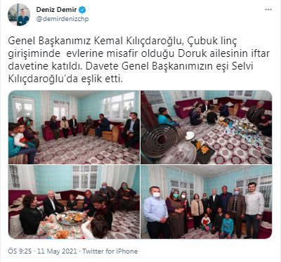 CHP Genel Başkanı Kemal Kılıçdaroğlu ile eşi Selvi Kılıçdaroğlu, Ankara'nın Çubuk ilçesine bağlı Akkuzulu Köyü'nde Doruk ailesinin iftar davetine katıldı. CHP Genel Başkan Başdanışmanı Deniz Demir, Doruk ailesinin, iki yıl önce Çubuk'taki linç girişiminde Kılıçdaroğlu'nu misafir eden aile olduğu bilgisini verdi.