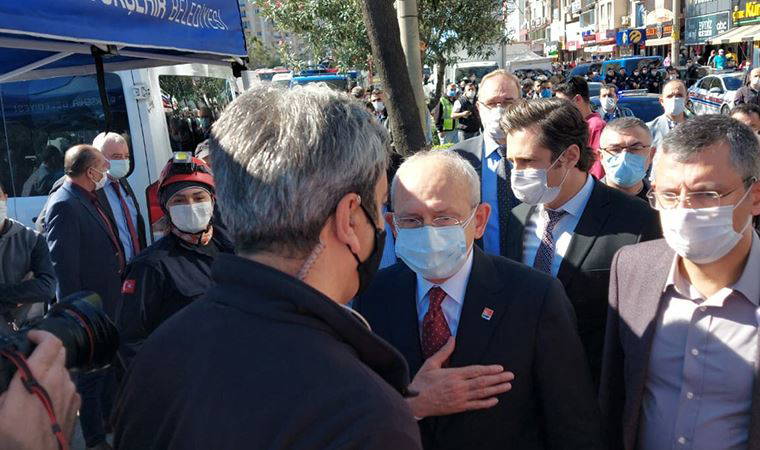 Bayraklı Belediye Başkanı Serdar Sandal da maske ve dezenfektan dağıtımı yaptıklarını, gece boyunca yapılan çalışmaları Kılıçdaroğlu’na aktardı. Kılıçdaroğlu ve CHP yönetimi daha sonra yıkılan Emrah Apartmanına geçti.