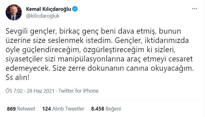 CHP Genel Başkanı paylaşımında, "Sevgili gençler, birkaç genç beni dava etmiş, bunun üzerine size seslenmek istedim. Gençler, iktidarımızda öyle güçlendireceğim, özgürleştireceğim ki sizleri, siyasetçiler sizi manipülasyonlarına araç etmeyi cesaret edemeyecek. Size zerre dokunanın canına okuyacağım. Ss alın!" ifadelerini kullandı.