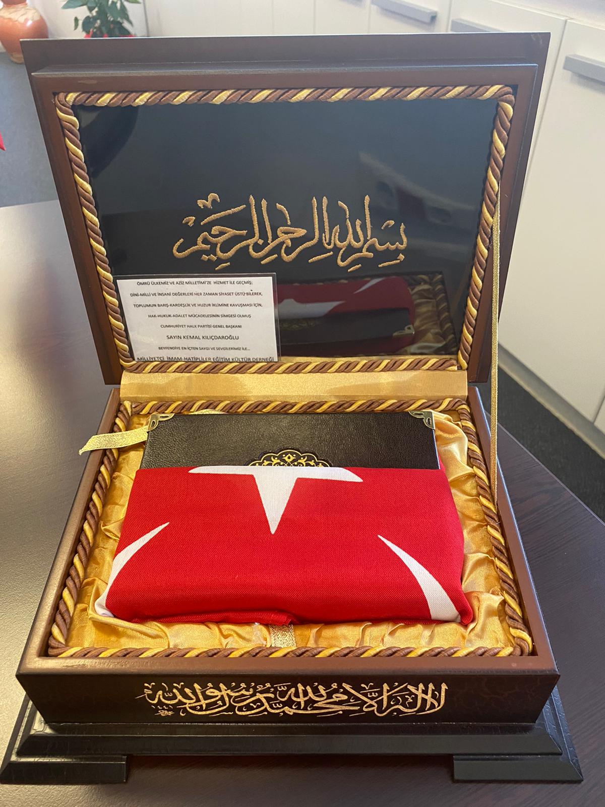Milliyetçi İmam Hatipliler Derneği, Kılıçdaroğlu’na bayrak ve Kuran hediye edecek. Hediyenin üzerinde ise şöyle yazıyor: “Ömrü ülkemiz ve aziz milletimize hizmet ile geçmiş, dini, milli ve insani değerleri her zaman siyaset üstü bilerek toplumun barış, kardeşlik ve huzur iklimine kavuşması için hak, hukuk, adalet mücadelesinin simgesi olmuş Cumhuriyet Halk Partisi Genel Başkanı Sayın Kemal Kılıçdaroğlu Beyefendi’ye en içten saygı ve sevgilerimizle...”
