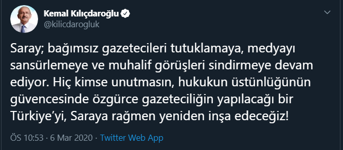 Sosyal medya hesabından paylaşım yapan Kılıçdaroğlu, ''Saray; bağımsız gazetecileri tutuklamaya, medyayı sansürlemeye ve muhalif görüşleri sindirmeye devam ediyor. Hiç kimse unutmasın, hukukun üstünlüğünün güvencesinde özgürce gazeteciliğin yapılacağı bir Türkiye'yi, Saraya rağmen yeniden inşa edeceğiz!'' ifadelerini kullandı.