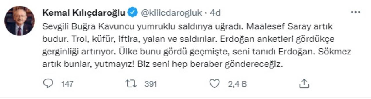 Olayla ilgili sosyal medya hesabından açıklama yayımlayan CHP Genel Başkanı Kemal Kılıçdaroğlu, "Sevgili Buğra Kavuncu yumruklu saldırıya uğradı. Maalesef Saray artık budur. Trol, küfür, iftira, yalan ve saldırılar. Erdoğan anketleri gördükçe gerginliği artırıyor. Ülke bunu gördü geçmişte, seni tanıdı Erdoğan. Sökmez artık bunlar, yutmayız! Biz seni hep beraber göndereceğiz" ifadelerini kullandı.