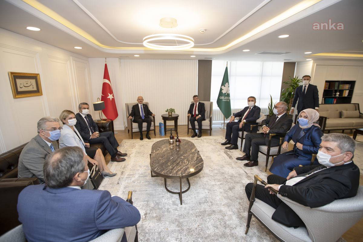CHP Genel Başkanı Kemal Kılıçdaroğlu, Gelecek Partisi Genel Başkanı Davutoğlu’na yeni parti kurması nedeniyle “hayırlı olsun ziyareti” yaptı. Kılıçdaroğlu’na, CHP Genel Sekreteri Selin Sayek Böke, CHP Genel Başkan Yardımcısı Seyit Torun, Oğuz Kaan Salıcı, Bülent Kuşoğlu eşlik etti. Kılıçdaroğlu ve Davutoğlu, bir buçuk saat süren görüşme sonrası yaptıkları basın toplantısında soruları da yanıtladı.