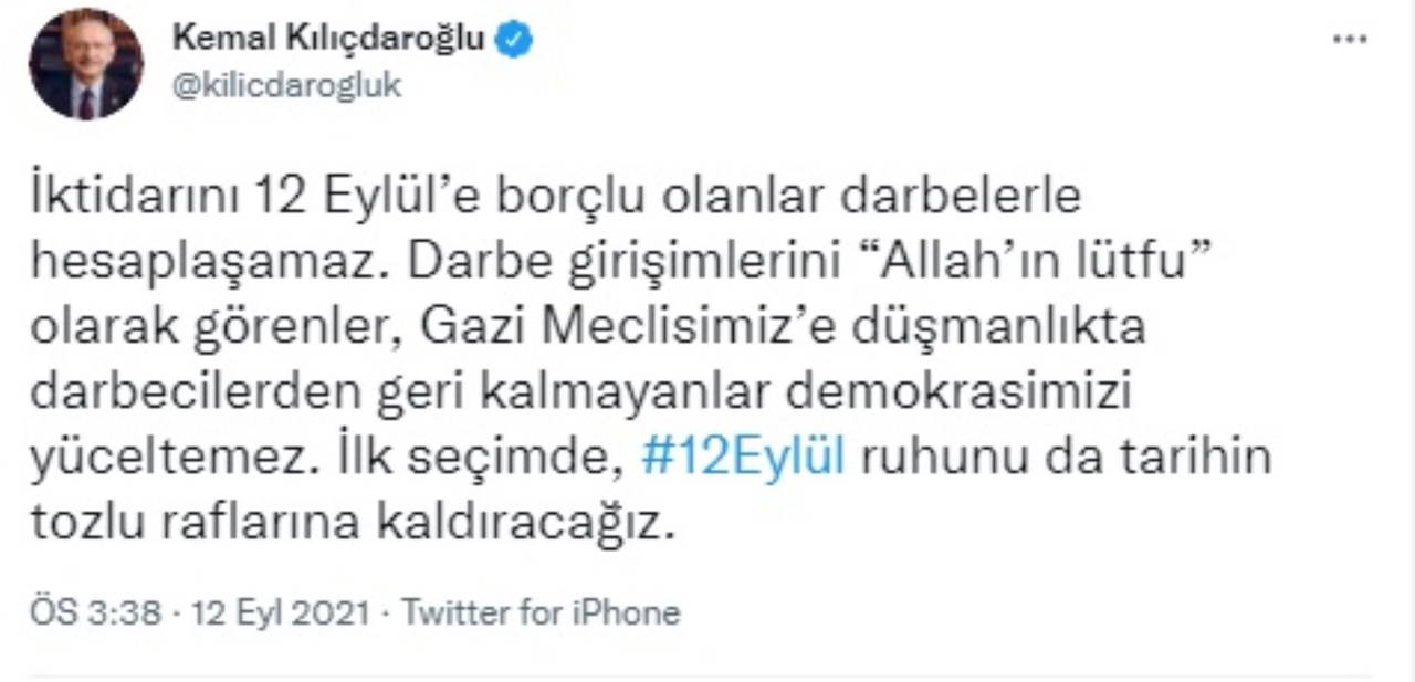 "İktidarını 12 Eylül’e borçlu olanlar darbelerle hesaplaşamaz. Darbe girişimlerini “Allah’ın lütfu” olarak görenler, Gazi Meclisimiz’e düşmanlıkta darbecilerden geri kalmayanlar demokrasimizi yüceltemez. İlk seçimde, 12 Eylül ruhunu da tarihin tozlu raflarına kaldıracağız."