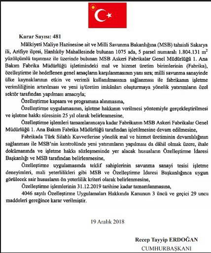 Şimdi sıra geldi silah fabrikasını satmaya. Bu 20 Aralık 2018 tarihli Cumhurbaşkanı kararnamesi, Resmi Gazete. Diyor ya biz bu fabrikayı satmadık diyor ya işte kendi imzası. MSB 1. Anabakım yönetimindeki fabrikanın özelleştirme kapsam ve programına alınmasına deniyor. İşletme hakkının 25 yıllığına verilmesine karar verilmiştir. Kimin imzası var Recep Tayyip Erdoğan.