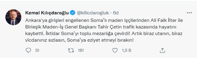 Ankara'ya girişleri engellenen Soma’lı maden işçilerinden Ali Faik İlter ile Birleşik Maden-İş Genel Başkanı Tahir Çetin'in trafik kazasında hayatını kaybettiğini belirten CHP lideri Kemal Kılıçdaroğlu, AKP iktidarına yönelik sert ifadeler kullandı.