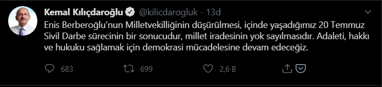 “Enis Berberoğlu’nun Milletvekilliğinin düşürülmesi, içinde yaşadığımız 20 Temmuz Sivil Darbe sürecinin bir sonucudur, millet iradesinin yok sayılmasıdır. Adaleti, hakkı ve hukuku sağlamak için demokrasi mücadelesine devam edeceğiz.