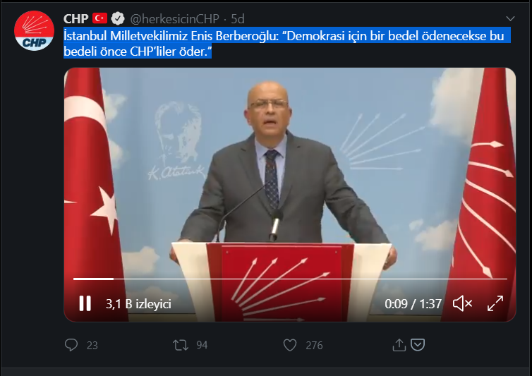 CHP'nin kurumsal twitter hesabından yapılan açıklamada ise, "'İstanbul Milletvekilimiz Enis Berberoğlu: “Demokrasi için bir bedel ödenecekse bu bedeli önce CHP’liler öder.'” ifadeleri kullanıldı.