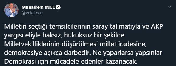 "Milletin seçtiği temsilcilerinin saray talimatıyla ve AKP yargısı eliyle haksız, hukuksuz bir şekilde Milletvekilliklerinin düşürülmesi millet iradesine, demokrasiye açıkça darbedir. Ne yaparlarsa yapsınlar Demokrasi için mücadele edenler kazanacak."