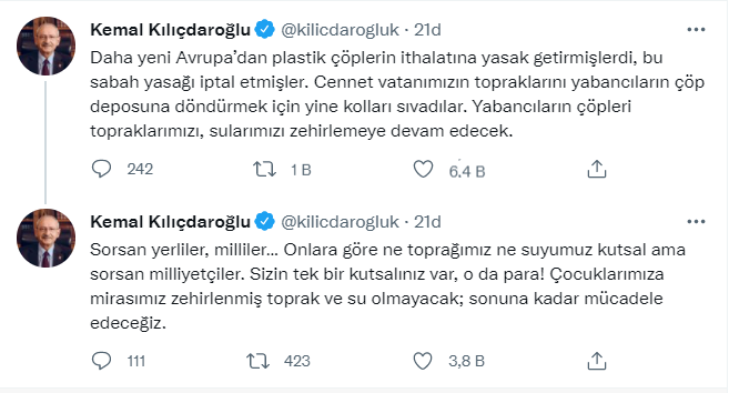 Sosyal medya hesabından çöp ithalatı (polietilen) yasağının iptal edilmesine tepki gösteren CHP lideri Kılıçdaroğlu, "Sorsan yerliler, milliler… Onlara göre ne toprağımız ne suyumuz kutsal ama sorsan milliyetçiler. Sizin tek bir kutsalınız var, o da para!" görüşünü dile getirdi.