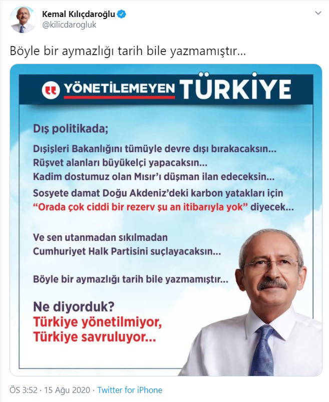 "Dış politikada; Dışişleri Bakanlığı’nı tümüyle devre dışı bırakacaksın. Rüşvet alanları büyükelçi yapacaksın. Kadim dostumuz olan Mısır’ı düşman ilan edeceksin. Sosyete damat Doğu Akdeniz’deki karbon yatakları için ‘Orada çok ciddi bir rezerv şu an itibariyle yok’ diyecek. Ve sen utanmadan, sıkılmadan Cumhuriyet Halk Partisi’ni suçlayacaksın. Böyle bir aymazlığı tarih bile yazmamıştır. Ne diyorduk? Türkiye yönetilmiyor, Türkiye savruluyor…"