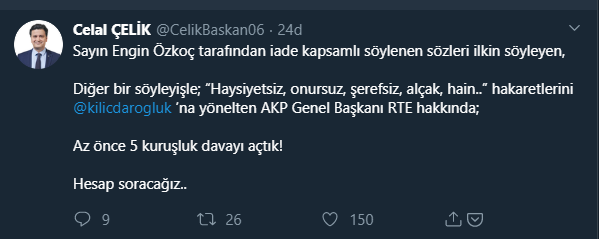 Çelik, başvurunun ardından sosyal medyadan yaptığı açıklamada, “Sayın Engin Özkoç tarafından iade kapsamlı söylenen sözleri ilkin söyleyen, diğer bir söyleyişle; 'Haysiyetsiz, onursuz, şerefsiz, alçak, hain..' hakaretlerini @kilicdarogluk'na yönelten AKP Genel Başkanı RTE hakkında; Az önce 5 kuruşluk davayı açtık! Hesap soracağız..." ifadelerini kullandı.