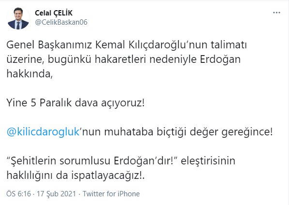 Kılıçdaroğlu’nun avukatı Celal Çelik, Twitter’dan yaptığı açıklamada, “Genel Başkanımız Kemal Kılıçdaroğlu’nun talimatı üzerine, bugünkü hakaretleri nedeniyle Erdoğan hakkında, Yine 5 paralık dava açıyoruz. Kılıçdaroğlu’nun muhataba biçtiği değer gereğince, ‘Şehitlerin sorumlusu Erdoğan’dır’ eleştirisinin haklılığını da ispatlayacağız” dedi.