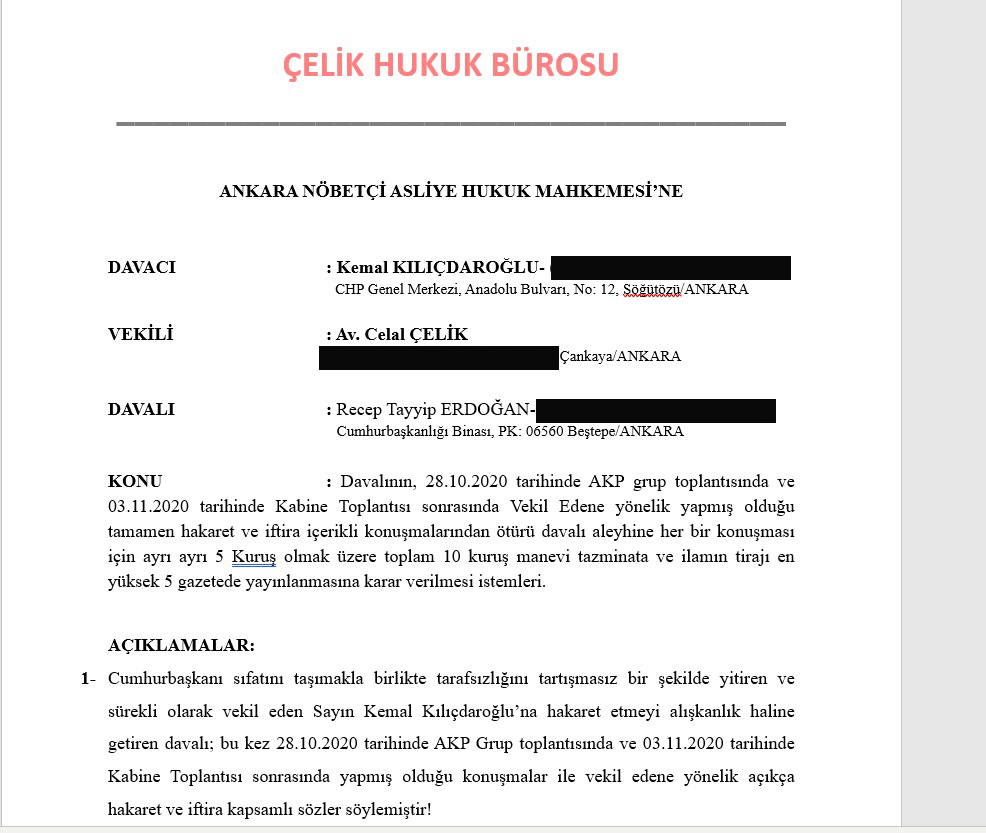 "Cumhurbaşkanı sıfatını taşımakla birlikte tarafsızlığını tartışmasız bir şekilde yitiren ve sürekli olarak vekil eden Sayın Kemal Kılıçdaroğlu’na hakaret etmeyi alışkanlık haline getiren davalı; bu kez 28.10.2020 tarihinde AKP Grup toplantısında ve 03.11.2020 tarihinde Kabine Toplantısı sonrasında yapmış olduğu konuşmalar ile vekil edene yönelik açıkça hakaret ve iftira kapsamlı sözler söylemiştir!
