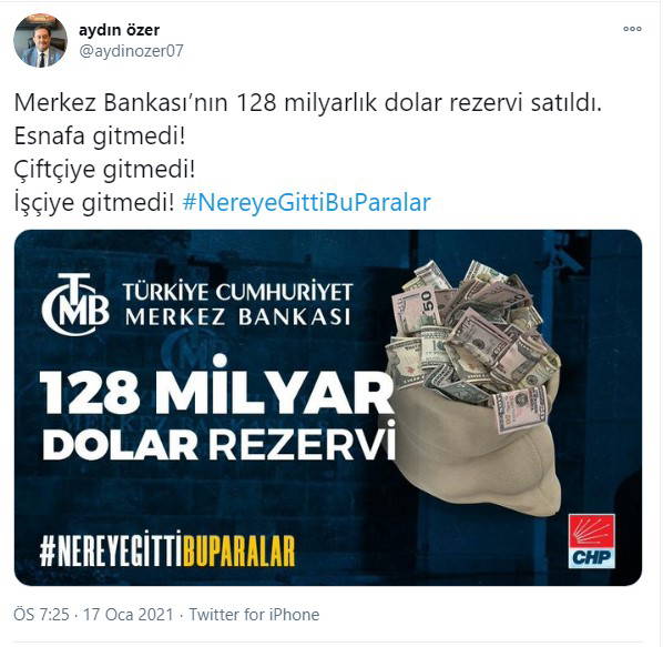 ''Nereye gitti bu paralar'' diyerek paylaşımda bulunan CHP Antalya Milletvekili Aydın Özer, ''Merkez Bankası’nın 128 milyarlık dolar rezervi satıldı. Esnafa gitmedi! Çiftçiye gitmedi! İşçiye gitmedi'' ifadelerini kullandı.