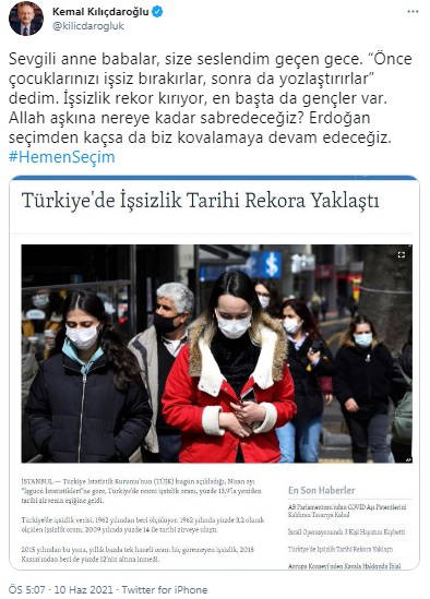Bu kez işsizlik rakamları üzerinden bir paylaşımda bulunan Kılıçdaroğlu, "Sevgili anne babalar, size seslendim geçen gece. “Önce çocuklarınızı işsiz bırakırlar, sonra da yozlaştırırlar” dedim. İşsizlik rekor kırıyor, en başta da gençler var. Allah aşkına nereye kadar sabredeceğiz? Erdoğan seçimden kaçsa da biz kovalamaya devam edeceğiz.” dedi.