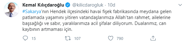 CHP lideri Kemal Kılıçdaroğlu, Sakarya'nın Hendek ilçesindeki havai fişek fabrikasında meydana gelen patlamada hayatını kaybeden vatandaşlar için başsağlığı mesajı yayımladı.