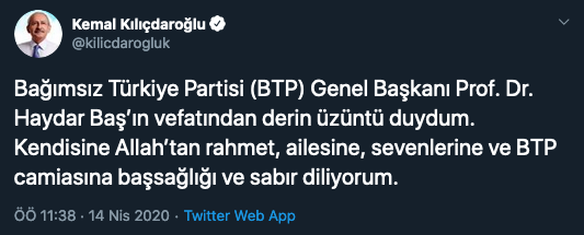 CHP Genel Başkanı Kemal Kılıçdaroğlu, koronavirüs nedeniyle yaşamını yitiren Haydar Baş hakkında başsağlığı mesajı yayımladı.