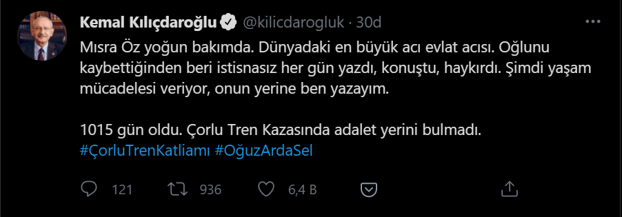 CHP Genel Başkanı Kemal Kılıçdaroğlu, Çorlu’daki tren kazasında 9 yaşındaki oğlunu ve eşini kaybeden ve koronavirüs nedeniyle yoğun bakıma kaldırılan Mısra Öz Sel ile ilgili sosyal medya hesabından bir paylaşım yaptı.