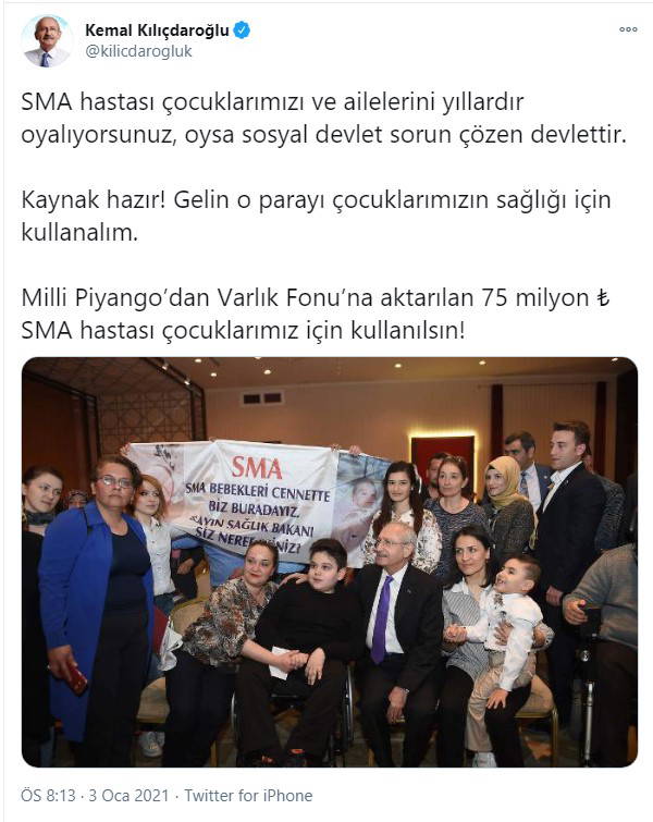 ''SMA hastası çocuklarımızı ve ailelerini yıllardır oyalıyorsunuz, oysa sosyal devlet sorun çözen devlettir. Kaynak hazır! Gelin o parayı çocuklarımızın sağlığı için kullanalım. Milli Piyango’dan Varlık Fonu’na aktarılan 75 milyon ? SMA hastası çocuklarımız için kullanılsın!"