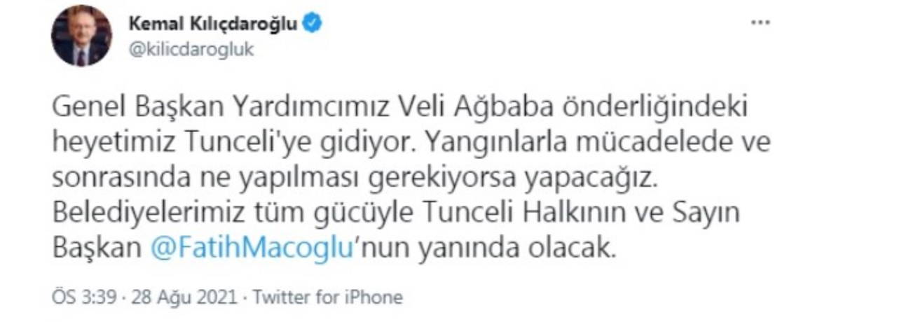 Genel Başkan Yardımcımız Veli Ağbaba önderliğindeki heyetimiz Tunceli'ye gidiyor. Yangınlarla mücadelede ve sonrasında ne yapılması gerekiyorsa yapacağız. Belediyelerimiz tüm gücüyle Tunceli Halkının ve sayın Başkan Fatih Mehmet Maçoglu’nun yanında olacak.
