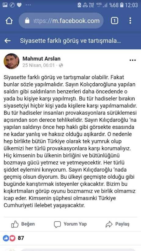 Arslan, hem suç duyurusu hem de hastanesinin uyarısı üzerine çirkin paylaşımını silmek zorunda kaldı ve bu kez “Kılıçdaroğlu’na saldırı provokasyondu” diye yazdı. Arslan, “Bu tür hadiseler bırakın siyasetçiyi hiçbir kişi yada kişilere karşı yapılmamalıdır. Bu tür hadiseler insanları provakasyonlara sürüklemesi açısından son derece tehlikelidir. Sayın Kılıçdaroğlu’na yapılan saldırıyı önce hep haklı gibi görsek de esasında ne kadar yanlış ve haksız olduğu aşikardır” paylaşımında bulundu.