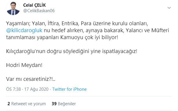 CHP Genel Başkanı'nın söylediklerinin doğru olduğunu ifade eden Celal Çelik,"Kılıçdaroğlu’nun doğru söylediğini yine ispatlayacağız! Hodri Meydan! Var mı cesaretiniz?" açıklamasında bulundu.