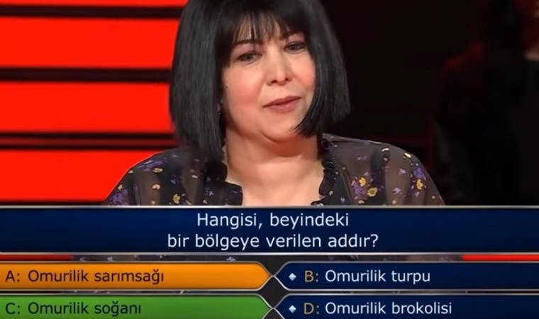 "Bir fikrim var ama telefonla joker hakkımı kullanmak istiyorum" diyen yarışmacı, aile hekimi olan doktor bir arkadaşını aradı. Soruyu defalarca okuyan kadın, doktor arkadaşının "Omurilik sarımsağı" seçeneğini söylemesinden sonra, kendisinin de aklına ilk olarak "Omurilik sarımsağı" seçeneğinin geldiğini ifade ederek, bu şıkkı seçti.